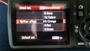 As you know, I do like a black and white picture.  However, when setting the Picture Style to Monochrome, there are further options that can help enhance your photos in camera.  I generally play around with the filter settings.  In my Canon, I have the option to choose between no filters, yellow through to green, as shown below: